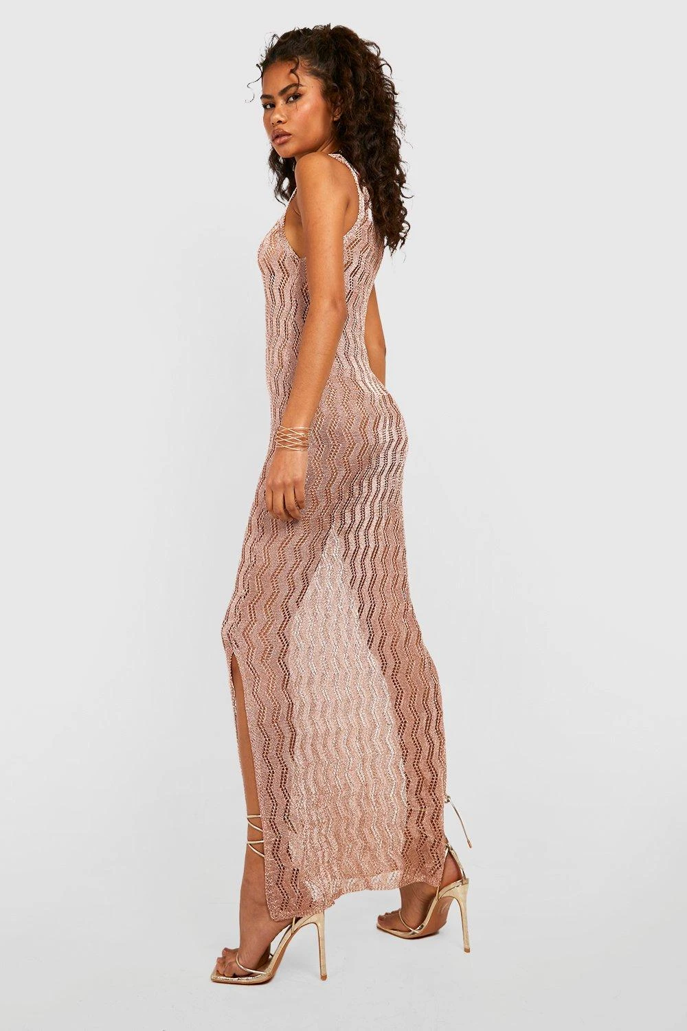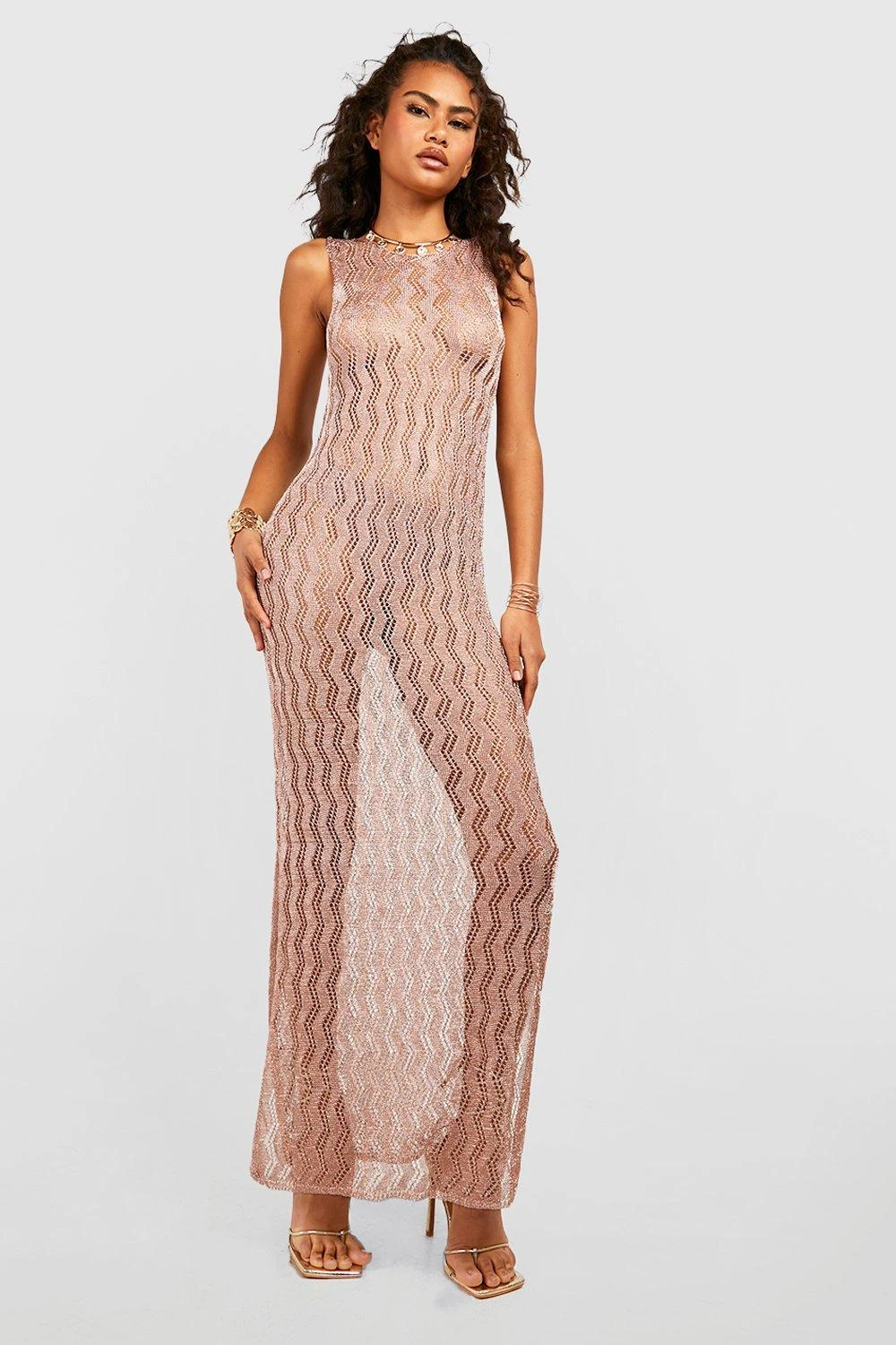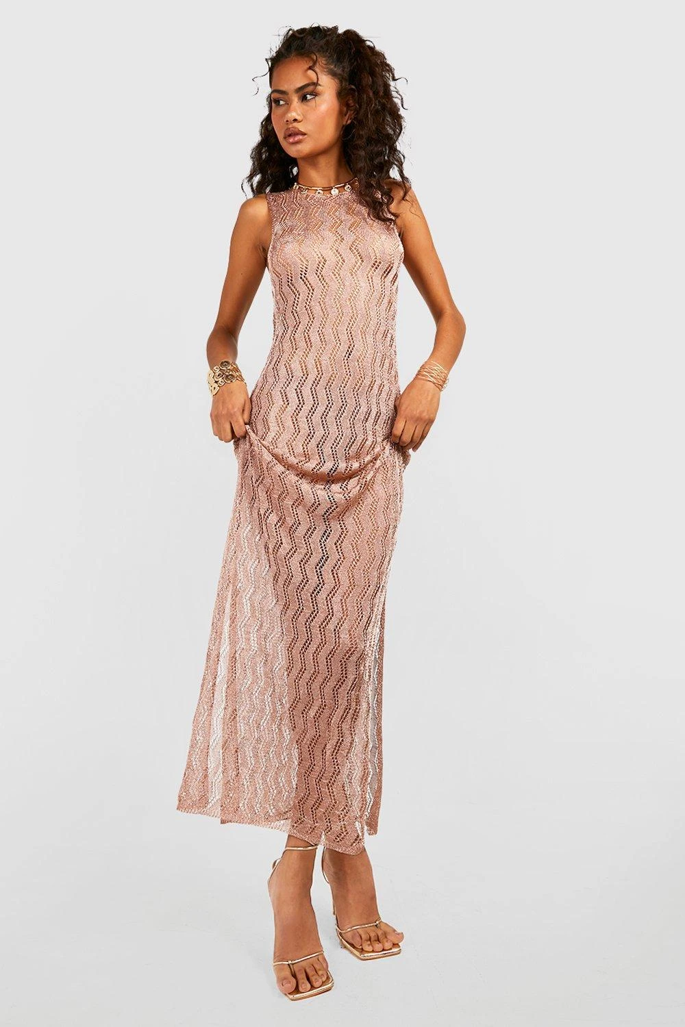 69% viscose, 31% fibres métallisées. Lavage à main uniquement. Le mannequin porte une taille M.