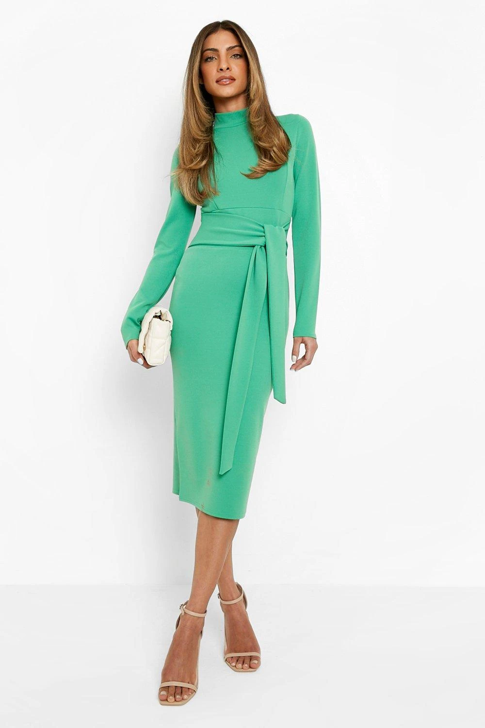 Robe Mi-longue Nouée à La Taille à Col Montant