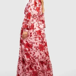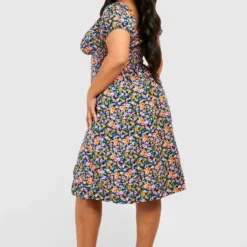 BOOHOO Grande Taille – Robe Mi-longue Fleurie Fendue à Manches Bouffantes