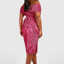 Grande Taille – Robe Cache-cœur Pailletée Mi-longue à épaules Dénudées